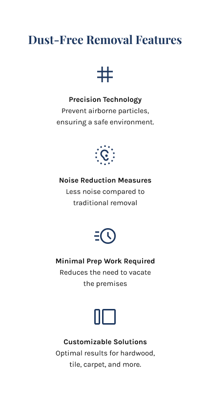 Removing old flooring without the dust storm typically associated with home renovations. A clean and efficient process, that your daily routines go uninterrupted, ensuring a hassle-free experience that's safe for children, and pets, it keeps the rest of your home pristine.